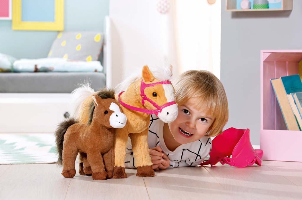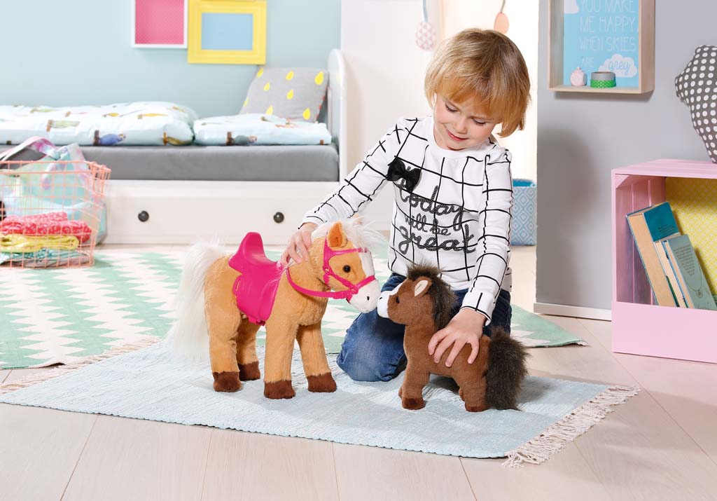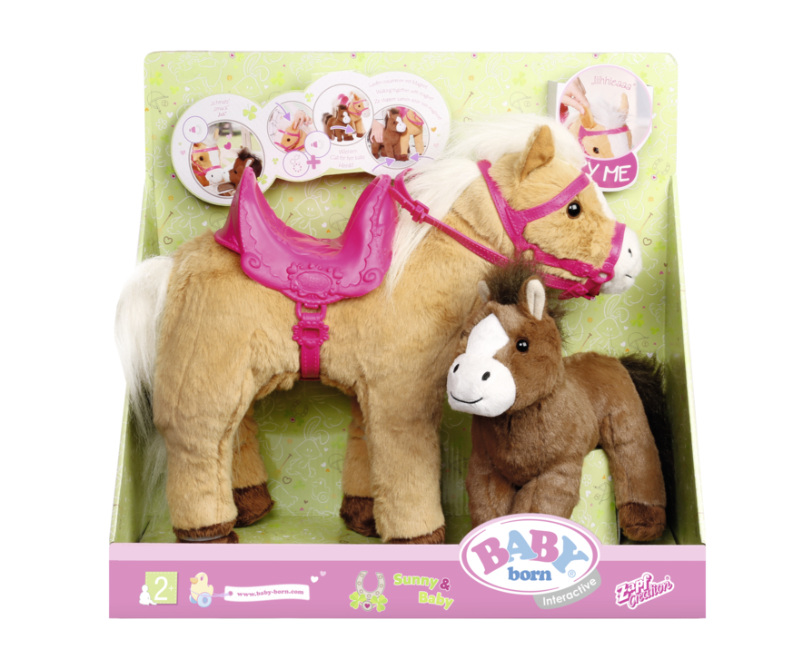 Když stisknete levé ucho koníka s bílou hřívou, vesele se rozejde kupředu. Když stisknete pravé ucho, uslyšíte, jak zaržá a jak zavolá na své tmavě hnědé hříbátko. Hříbátko se pak u své maminky hezky drží. V nožičkách totiž mají koníci magnet, a když jsou u sebe, jdou spolu. Dotknou-li se koníci čumáčky, uslyšíte, jak si dají pusinku. Součástí balení je i růžové sedlo, aby na koníkovi mohla jezdit panenka BABY born®.